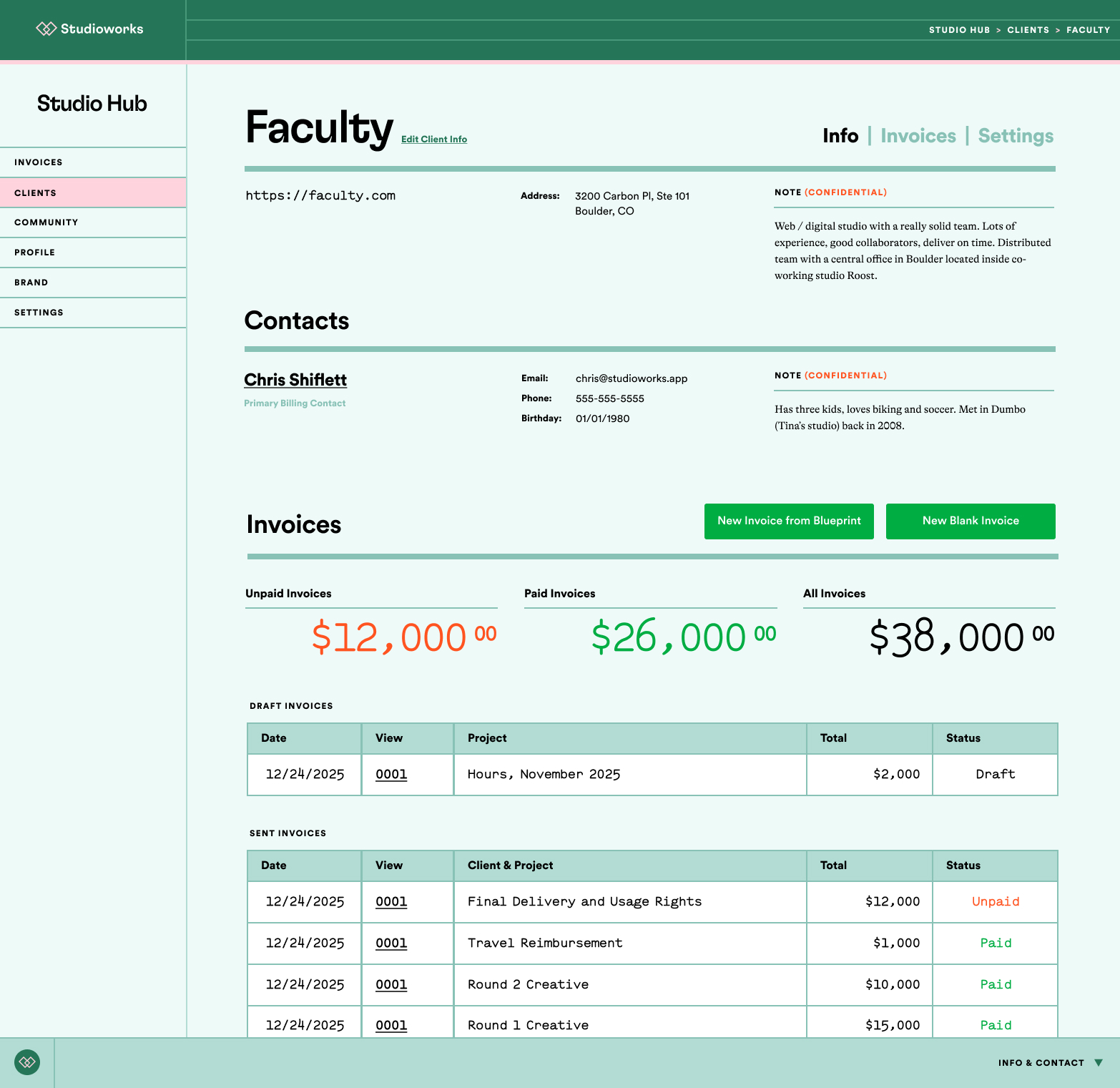 Studioworks is member-supported business software, interactive tools, educational resources, and community for independent creatives and small studios. Brings your clients, contacts, invoices, and payments together in one beautiful, branded-by-you, professional home — so your business looks as good as your work.